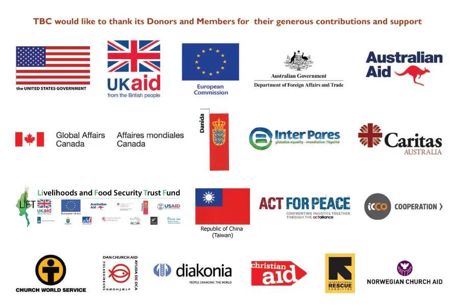 Approximately 95 percent of its funding came from government donors such as the UK,  Australia and New Zealand. Although most of TBC’s funds are now institutional, it still continues to receive funds from individuals, private foundations and organisations and churches. These contributions are particularly encouraging and uplifting for our staff and members. To make a donation, please visit the Donation page.