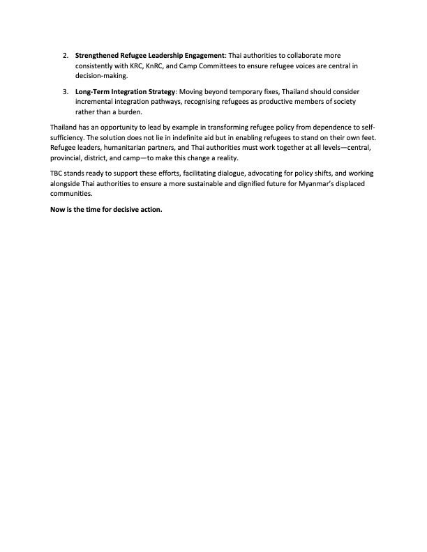 For over 50 years, Myanmar’s displaced communities have sought refuge in Thailand, relying on humanitarian aid for survival. However, the landscape is rapidly changing, and continued reliance on external aid is no longer a sustainable solution. With recent global shifts—particularly the uncertainty following the U.S. foreign aid review—TBC, alongside refugee leadership and key partners, is advocating for meaningful policy changes to allow refugees to contribute to their own well-being and to Thai society. See our full statement attached.