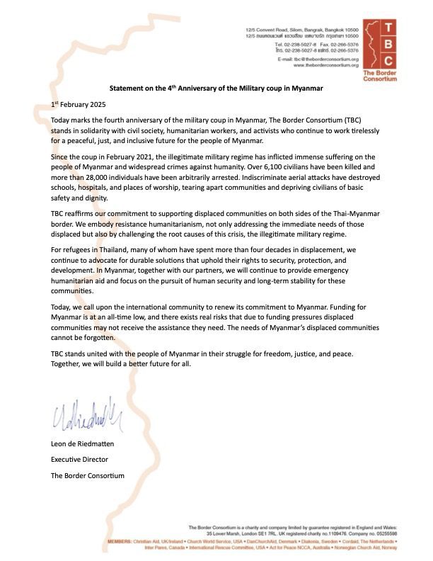 Today marks the fourth anniversary of the military coup in Myanmar, The Border Consortium stands in solidarity with civil society, humanitarian workers, and activists who continue to work tirelessly for a peaceful, just, and inclusive future for the people of Myanmar.