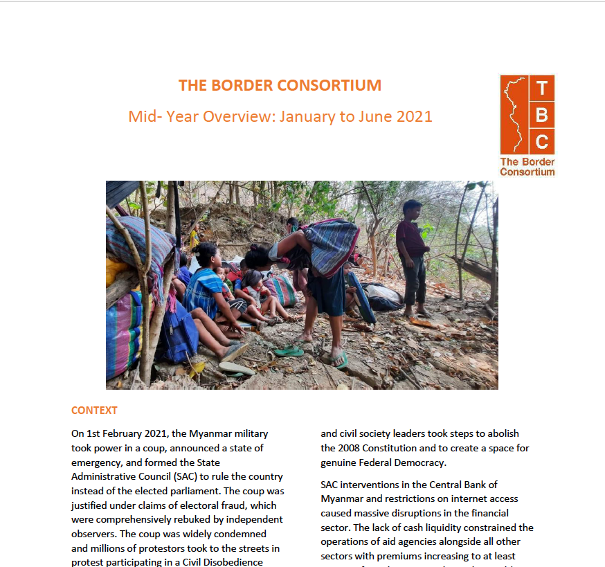 ภาพรวมกลางปีของ TBC ซึ่งนําเสนอการอัปเดตหกเดือน (ม.ค. – มิ.ย. 2021) เกี่ยวกับสถานการณ์ของผู้ลี้ภัยและโครงการ ทิศทางเชิงกลยุทธ์ และการเงินของ TBC มีให้บริการเป็นภาษาอังกฤษ ที่นี่ และ ภาษาพม่าที่นี่
